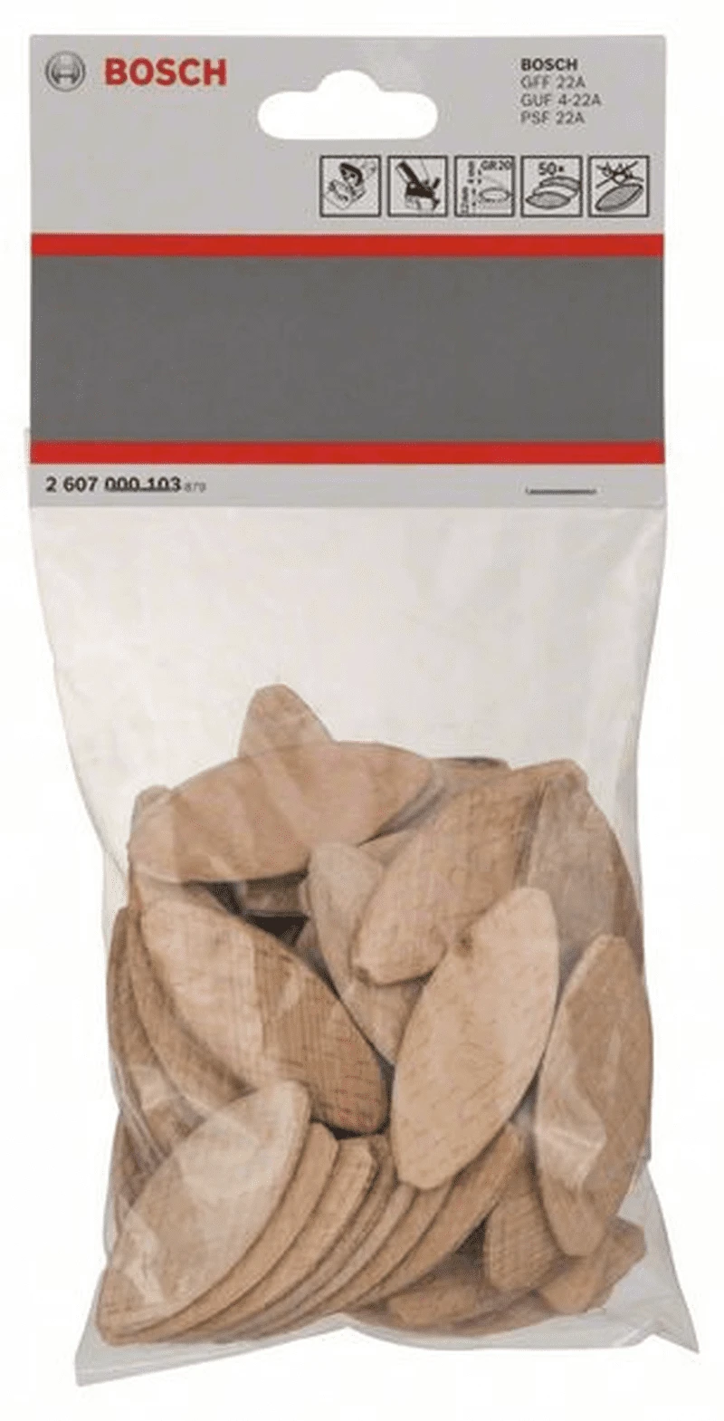 Flachdübel für Bosch-Flachdübelfräse. Flachdübel GR 20, Länge: 60 mm, Breite: 23 mm, Höhe: 4 mm. Flachdübel Größe 20 für perfekt passende Verbindungen. Inhalt der Verkaufsverpackung in Stück: 50.