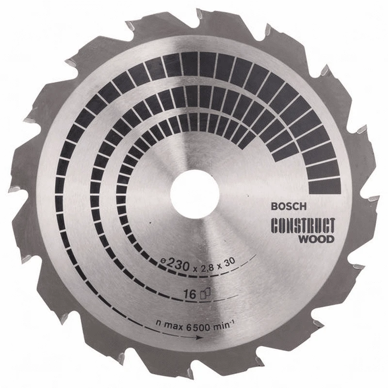 Kreissägeblatt Construct Wood für Handkreissägen. Außendurchmesser: 230 mm, Bohrung: 30 mm, Schnittbreite: 2,8 mm, Zähnezahl: 16. Das spezielle Zahndesign und die breite Abstützung im Zahnrücken sorgen für eine hohe Widerstandskraft und schneiden Baustellenholz mit Fremdkörpern wie Nägel und Betonreste.