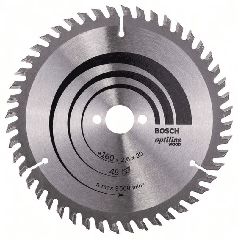 Kreissägeblatt Optiline Wood für Handkreissägen. Außendurchmesser: 160 mm, Bohrung/Bohrung mit Reduzierring: 20/16 mm, Schnittbreite: 2,6 mm, Stammblattstärke: 1,6 mm, Zähnezahl: 48, Typ: Standard for Wood, Zahnform: WZ, Schnittresultat: 4,0, NL/Durchmesser TKS: 6/32. Das präzise Blatt für den Qualitätsschnitt in allen Holzarten. Sehr feiner Schnitt ideal für Weich-, Hart-, Press- und Schichtholz sowie Span-, Tischler- und MDF-Platten. Stammblatt aus formstabilem SK5 Stahl, gehärtet ( größer als 40 HRC). Mit Hartmetallzähnen für saubere Schnitte dank hochwertigem Hartmetall und präzise Schliffe. Körper- und Dehnungsschlitze vermindern Schwingungen. Wirken geräuschdämpfend und reduzieren die Hitzeentwicklung.