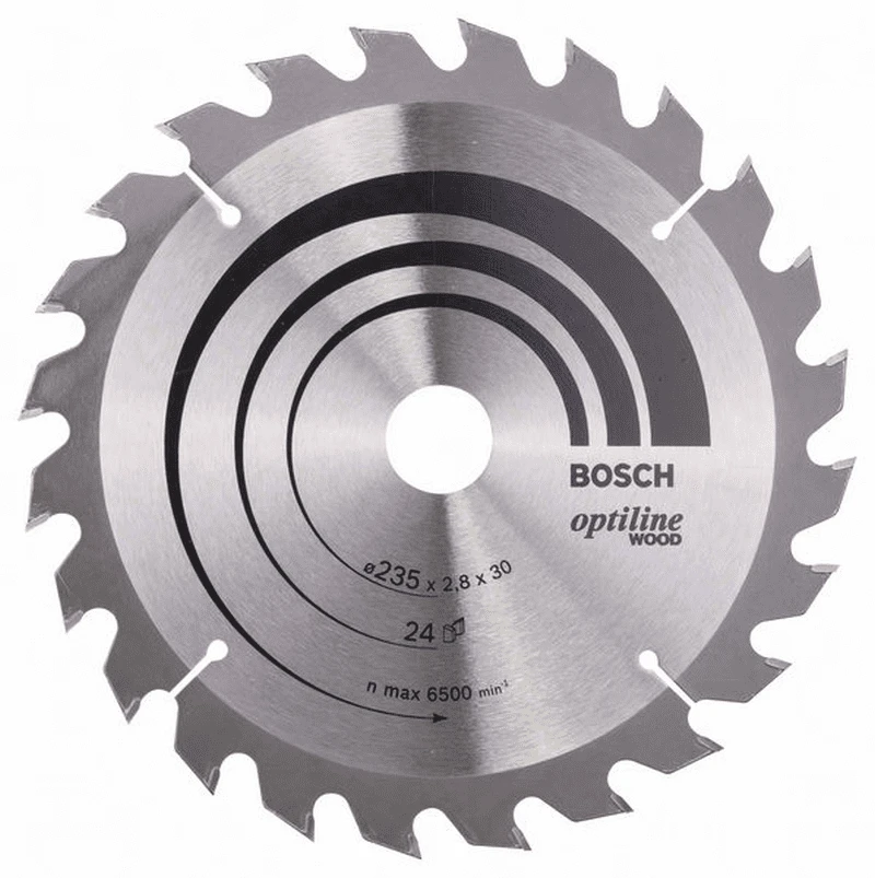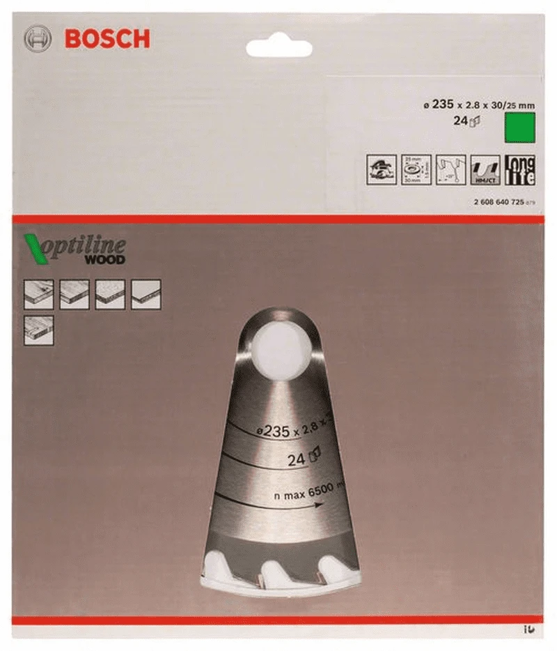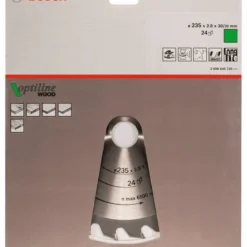 Kreissägeblatt Optiline Wood für Handkreissägen. Außendurchmesser: 235 mm, Bohrung/Bohrung mit Reduzierring: 30/25 mm, Schnittbreite: 235 x 30/25 x 2,8 mm, Zähnezahl: 24. Das präzise Blatt für den Qualitätsschnitt in allen Holzarten.