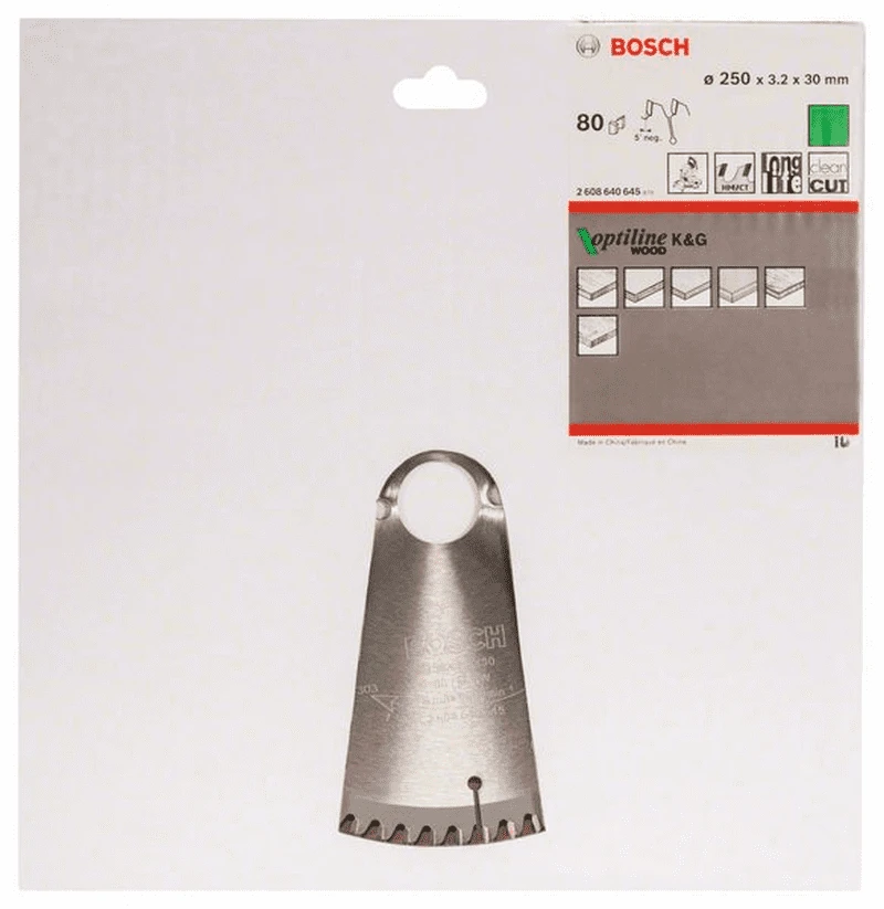 Kreissägeblatt Optiline Wood für Kapp- und Gehrungssägen. Außendurchmesser: 250 mm, Bohrung: 30 mm, Schnittbreite: 3,2 mm, Zähnezahl: 80, Zahnform: WZ Negativ. Das präzise Blatt für den Qualitätsschnitt in allen Holzarten.