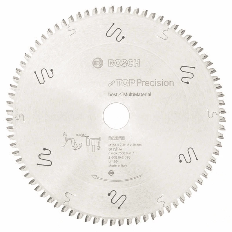 Kreissägeblatt Top Precision Best for Multi Material, für Kapp-, Gehrungs- und Paneelsägen, Außendurchmesser: 254 mm, Bohrung: 30 mm, Schnittbreite: 2,3 mm, Zähnezahl: 80, ein höchst vielseitiges Blatt, für exzellente Ergebnisse in Nichteisenmetalle, Aluminium, Kunststoffe, Epoxy und Holz, Verwendung des Universalschneidöls 2 607 001 409 erhöht die Standzeit bei Schnitten in Metall z. B. Aluminium um ein Mehrfaches, Zähne aus Microteq: Hartmetallzähne aus besonders dichtem Hartmetallpulver mit mikrofeiner Körnung minimieren die Abnutzung der Schneide für beste Schnittqualität und besonders hohe Lebensdauer, Beschichtung Cleanteq: verringert das Anhaften von Rückständen (Harz, Leim), dadurch extrasaubere Ergebnisse, schützt das Blatt vor Korrosion, hält das Blatt kühl, Vibrationsminderung mit Stabilteq: Polyrethangefüllte Dämpfungsschlitze verringern stark die Vibrationen und Geräuschentwicklung, dies verbessert die Schnittpräzision und den Arbeitskomfort, mit lasergeschnittenen Dehnungsschlitzen für hohe Blattstabilität und Genauigkeit, die besondere Gestaltung sorgt für geringere Geräuschpegel, Stahlkörper: erstklassiger Stahl (bis HRC 46) für hohe Haltbarkeit, lasergeschnitten für hohe Präzision ohne Blattverzug, dank dem speziell eingerollten Spannungsring bleibt das Blatt auch im Einsatz formstabil und perfekt eben, Schnittresultat: sehr feiner Schnitt, Spanwinkel -5°, Freiwinkel 15°