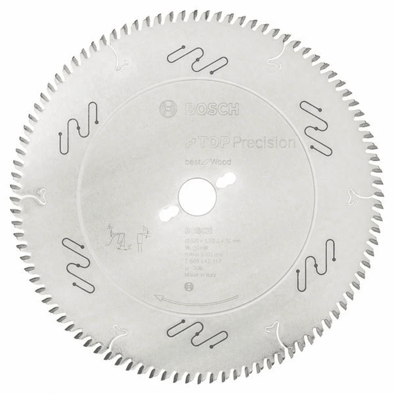 Kreissägeblatt Top Precision Best for Wood für horizontale/vertikale Format- und Tischkreissägen, Außendurchmesser: 300 mm, Bohrung: 30 mm, Schnittbreite: 3,2 mm, Zähnezahl: 96, für professionelle Holzverarbeiter, Zähne aus Microteq: Hartmetallzähne aus besonders dichtem Hartmetallpulver mit mikrofeiner Körnung minimieren die Abnutzung der Schneide für beste Schnittqualität und besonders hohe Lebensdauer, Beschichtung Cleanteq: verringert das Anhaften von Rückständen (Harz, Leim), dadurch extrasaubere Ergebnisse, schützt das Blatt vor Korrosion, hält das Blatt kühl, Vibrationsminderung mit Stabilteq: Polyrethangefüllte Dämpfungsschlitze verringern stark die Vibrationen und Geräuschentwicklung, dies verbessert die Schnittpräzision und den Arbeitskomfort, mit lasergeschnittenen Dehnungsschlitzen für hohe Blattstabilität und Genauigkeit, die besondere Gestaltung sorgt für geringere Geräuschpegel, Stahlkörper: erstklassiger Stahl (bis HRC 46) für hohe Haltbarkeit, lasergeschnitten für hohe Präzision ohne Blattverzug, dank dem speziell eingerollten Spannungsring bleibt das Blatt auch im Einsatz formstabil und perfekt eben, Schnittresultat: sehr feiner Schnitt, Spanwinkel 5 Grad, Freiwinkel 18 Grad