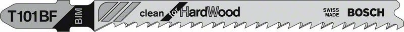 Stichsägeblatt Clean for Hard Wood. Typ: T 101 BF. Werkstoff: BIM. Zahnausführung: freiwinkel-, zähnegeschliffen. Gesamtlänge: 100 mm, Zahnteilung: 2,7 mm. Einnockenschaft, sauberer Schnitt. Einsatzbereiche: Für Hartholz, Platten, Laminate und beschichtete Platten/HPL von 3 bis 30 mm Stärke, für GFK/Epoxy kleiner als 30 mm Stärke. Inhalt der Verkaufspackung: 5 Stück.