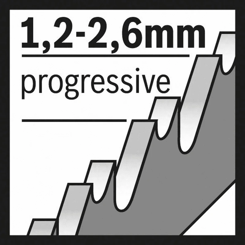 Stichsägeblatt Progressor for Metal, Typ: T 123 X, Werkstoff: HSS, Zahnausführung: geschränkt, gefräst, Gesamtlänge: 100 mm, Zahnteilung: 1,2 – 2,6 mm, Einnockenschaft, schnell durch dick und dünn, Einsatzbereiche: für dünne bis starke Bleche von 1,5 bis 10 mm Stärke, für Rohre, geschlossene Profile und Aluminium kleiner als 30 mm Stärke, Inhalt der Verkaufspackung: 10 x 5 Stück
