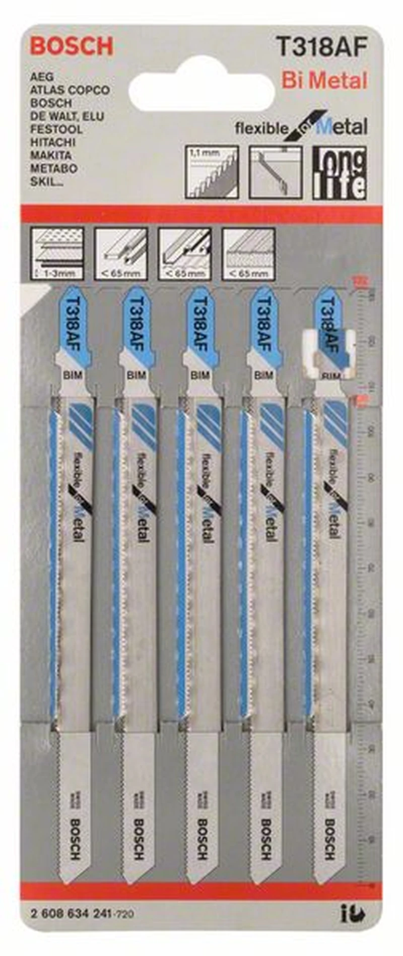 Stichsägeblatt Flexible for Metal. Typ: T 318 AF. Werkstoff: BIM. Zahnausführung: gewellt, gefräst, Gesamtlänge: 132 mm, Zahnteilung: 1,1 mm. Einnockenschaft. Bruchfest und langlebig. Einsatzbereiche: Für dünne Bleche, Lochbleche von 1 bis 3 mm Stärke. Für Sandwichmaterialien kleiner als 65 mm Stärke. Für Rohre und offene Profile. Für Rohre und geschlossene Profile und Aluminium kleiner als 65 mm Stärke. Für GFK/Epoxy kleiner als 65 mm Stärke. Inhalt der Verkaufspackung: 5 Stück.