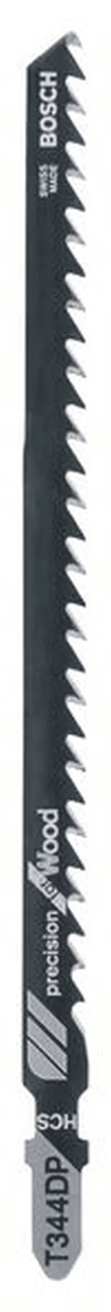 Stichsägeblatt Precision for Wood. Typ: T 344 DP. Werkstoff: HCS. Zahnausführung: geschränkt, geschliffen. Gesamtlänge: 152 mm, Zahnteilung: 4 mm. Einnockenschaft, winkelgenauer Schnitt. Einsatzbereiche: Für dickes Bauholz und Weichholz von 5 bis 100 mm Stärke. Für Span-, Tischler-, Faserplatten, für Grobholz kleiner als 100 mm Stärke. Inhalt der Verkaufspackung: 5 Stück.