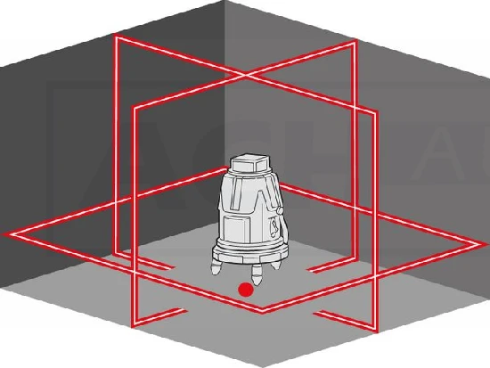- mit einer 360°-horizontalen und vier vertikalen Laserlinien im 90°-Winkel plus Lot