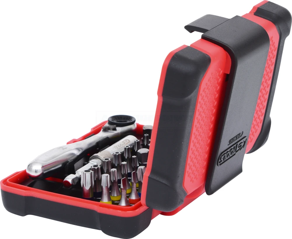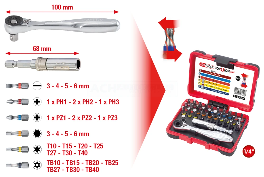 - präzise und ordentliche Anordnung der gängigsten 1/4″ Bits