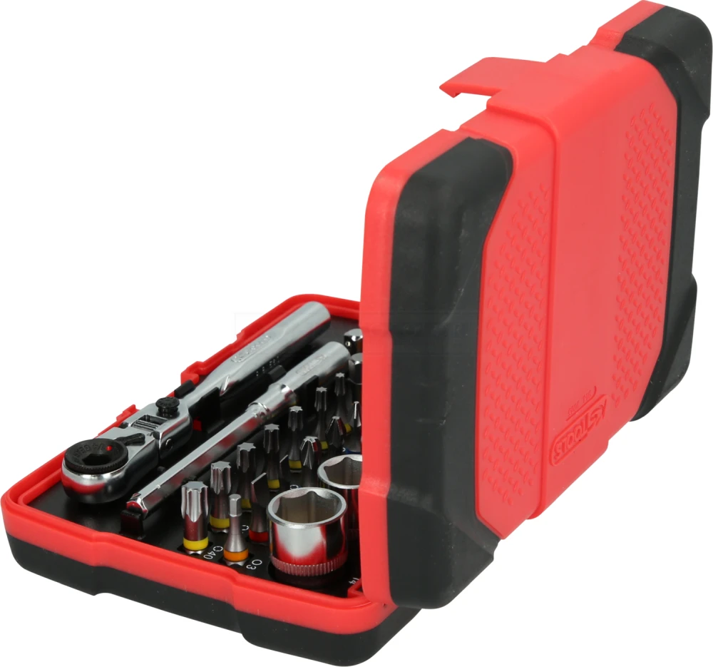 - präzise und ordentliche Anordnung der gängigsten 1/4″ Bits und Stecknüsse