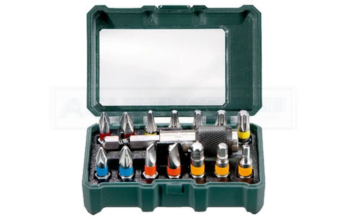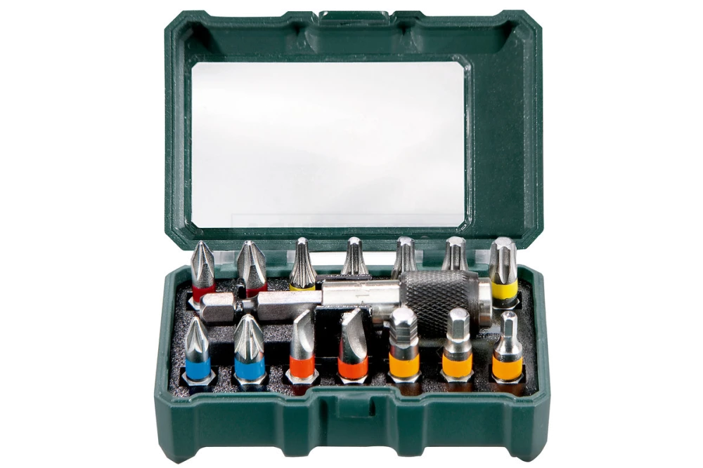 Bits aus Chrom-Vanadium-Stahl (S2-Qualität); Bits mit Farbcodierung: für ein schnelles und einfaches Auffinden des passenden Bits; Magnetischer Schnellwechseladapter; Hochwertige, robuste Box im speziellen Metabo-Design; abnehmbarer Euroloch-Aufhänger